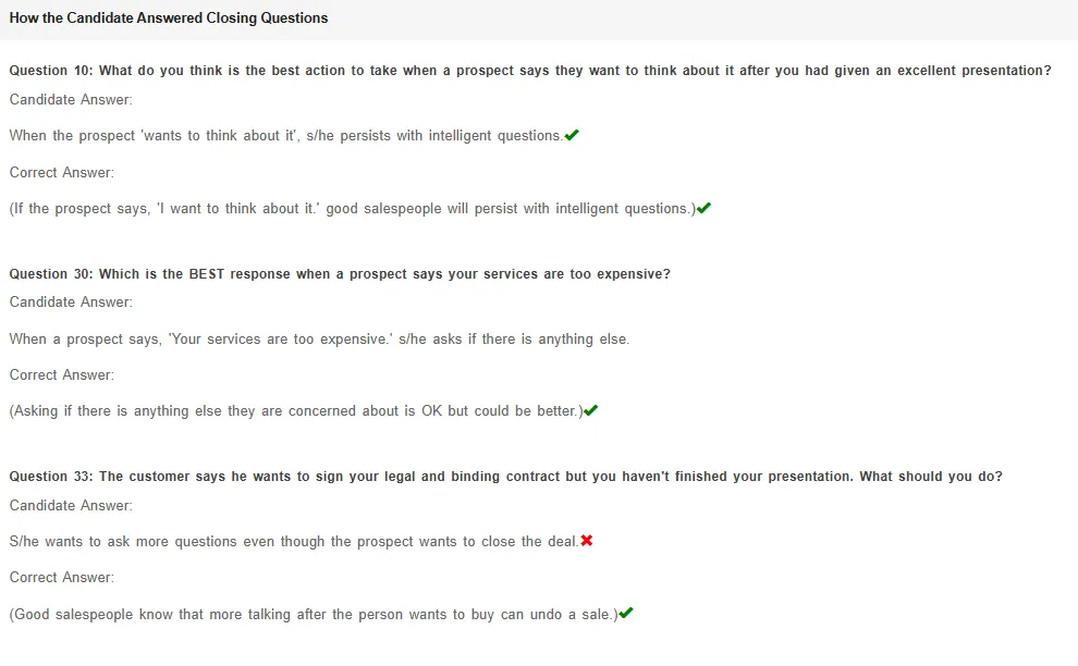 This section highlights candidate answers to real sales situations, compared to the correct best practices. It reveals how well the candidate handles objections, closing, and customer interactions.